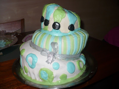 Az alsó rész vaníliás piskóta csokikrémmel, fehér alapon színes pöttyökkel, a középső csokis piskóta vanília krémmel, fehér alapon színes csíkokkal, és a legfelső pedig vörösbársony (ami inkább pink bársony lett), sajtkrémmel, és fehér alapon színes rombuszokkal, fekete pontokkal.
