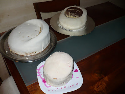 Aztán bevontuk őket a fondant-al, ami kicsit nehézre sikeredett, mert nem olyan lett a fondant, amire számítottam, illetve amilyeneket eddig csináltam. De megoldottuk. :) Utána kivágtuk a közepüket, ahova majd bepasszolnak a felső emeletek.